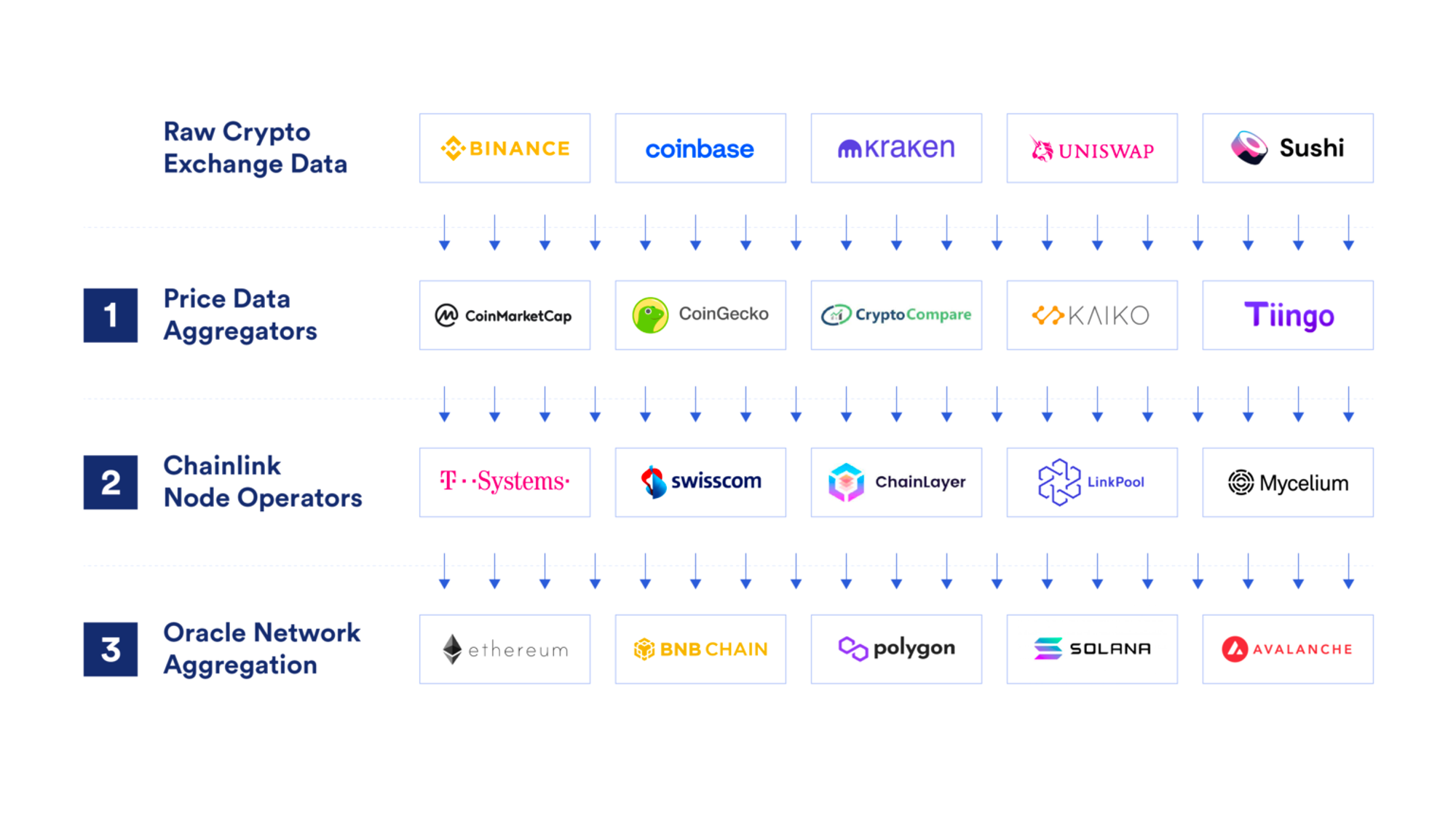 ChainLink relies on a network of independent node operators who are rewarded with LINK tokens in exchange for honest and high-quality performance as oracles. These independent nodes deposit LINK tokens as collateral and are punished for poor performance, whether malicious or not.