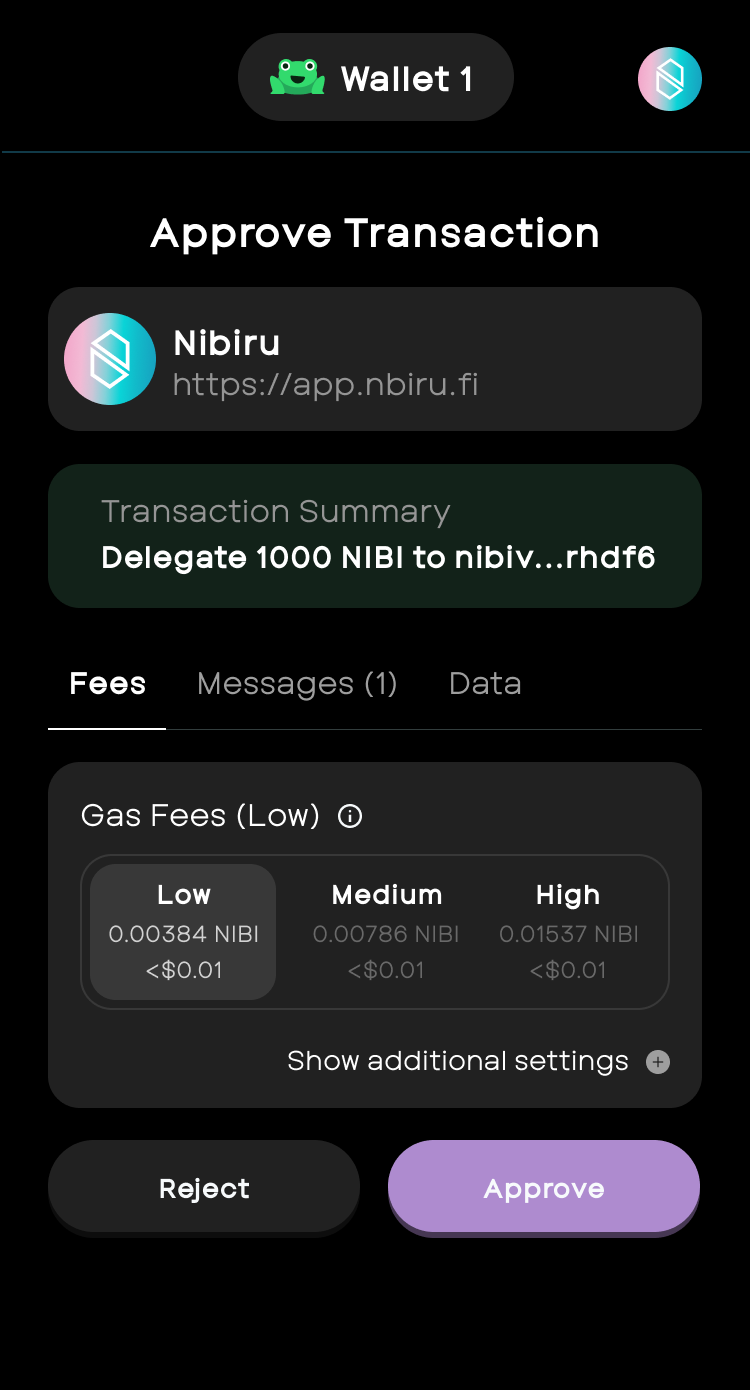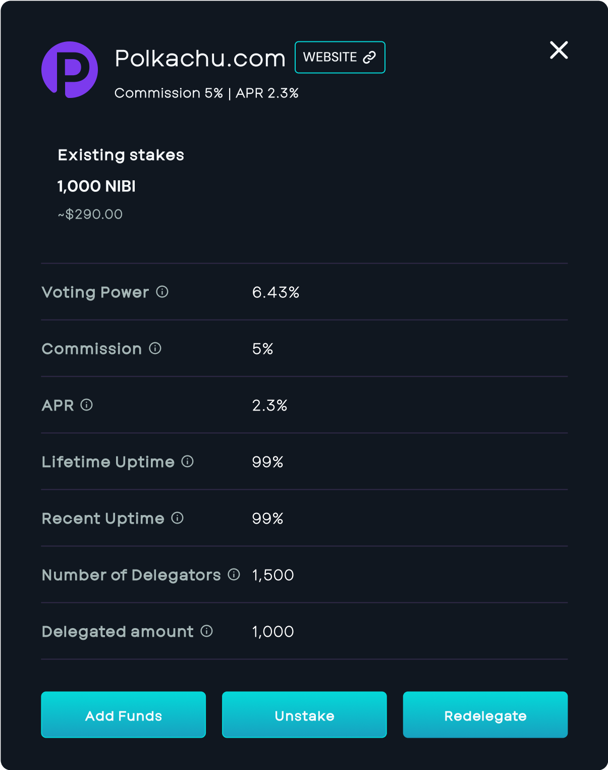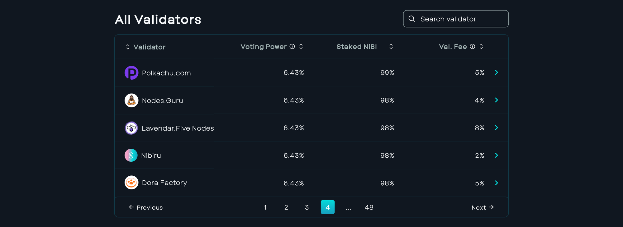 Choose a validator to stake with. While you don't have to pick Nibiru's validator, there are many validators available for delegation.
