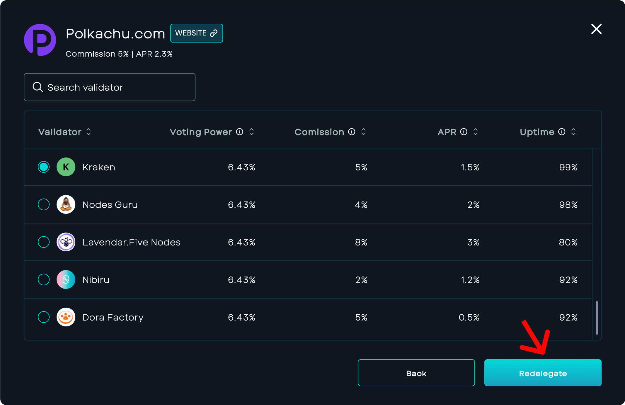 However, if you choose to “Redelegate” NIBI, you can stake it with another validator.